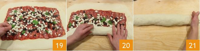 Espalhe uma camada de fatias de salame picante, as alcaparras, os pedaços de anchovas 16, as azeitonas em rodelas e os cubos de mussarela escorridos 17. Pincele as bordas com um pouco de água 18 para selar melhor o rolo.