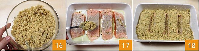 e misture bem para umedecer a crosta 16. Cubra toda a superfície do salmão marinado com a crosta umedecida (17-18). Cozinhe o salmão marinado em forno pré-aquecido em modo estático a 180° por 10 minutos (ou em forno ventilado a 160° por 6-7 minutos). Após os 10 minutos, mude o modo do forno de estático para grill, aumente a temperatura para 230° e gratine o salmão marinado por mais 5 minutos. Quando a crosta estiver bem dourada, retire o salmão marinado do forno e deixe esfriar por alguns minutos antes de servir.
