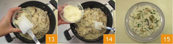 Depois de cozido, misture o risoto com o fogo desligado, adicionando a manteiga 13 e o parmesão ralado 14, e misture bem. Para obter um risoto perfeito, você pode adicionar outra concha de caldo, se necessário. Por fim, decore com salsa fresca picada e seu risoto de cogumelos porcini está pronto para ser servido 15!