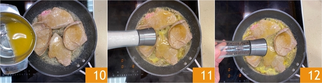 Doure as fatias também do outro lado por 1-2 minutos, em seguida despeje o suco de laranja 10. Tempere com sal 11 e pimenta 12.