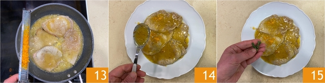 Adicione boa parte da casca de laranja ralada 13; misture bem para dissolver o fundo de cozimento e vire as fatias algumas vezes para que absorvam o sabor. Continue cozinhando em fogo baixo por alguns minutos, até que o fundo engrosse e fique cremoso; no total, levará cerca de 8 minutos. Agora só falta embelezar suas escalopes ao molho de laranja: transfira-as para um prato de servir, adicione o molho 14 e algumas folhinhas de tomilho 15.