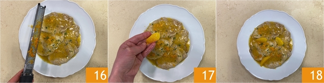 Finalize com um pouco da casca de laranja reservada 16, os gomos 17 e sirva suas escalopes ao molho de laranja bem quentes 18!