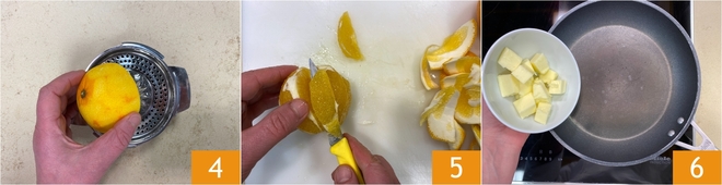 Esprema uma das laranjas 4: deve-se obter cerca de 80 g de suco. Descasque a outra laranja e separe os gomos com a ajuda de uma faca 5. Coloque a manteiga em uma frigideira grande 6 e deixe derreter em fogo baixo.