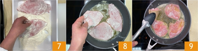 Enquanto isso, enfarinhe as fatias de carne uma por uma, retirando o excesso de farinha sacudindo levemente 7. Quando a manteiga estiver completamente derretida, aumente um pouco o fogo e coloque as fatias na frigideira 8. Deixe dourar por 1-2 minutos, depois vire-as 9.