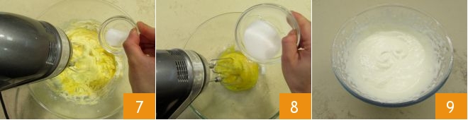 depois adicione o sal 7 e continue a bater a mistura com a batedeira até obter uma consistência macia e cremosa. Reserve e em outra tigela, coloque os dois ovos inteiros e adicione o açúcar refinado 8; bata tudo com a batedeira e assim que esta mistura de ovos e açúcar estiver clara, lisa e espumosa 9