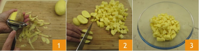 Para preparar a abóbora e batatas assadas, comece descascando as batatas 1. Depois de descascadas, pesarão cerca de 550 g. Lave-as para eliminar eventuais resíduos de terra. Corte as batatas primeiro em fatias e depois em cubos grandes de cerca de 2 cm 2. Transfira-as para uma tigela 3 e reserve.