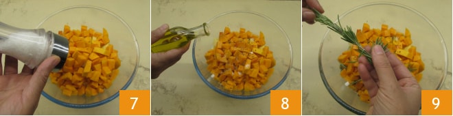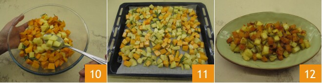 Misture bem 10, então transfira para uma assadeira forrada com papel manteiga 11. Espalhe bem a abóbora e as batatas para que não se sobreponham. Asse em forno estático pré-aquecido a 200° por 40 minutos e, nos últimos 5 minutos de cozimento, ligue o grill para que fiquem mais douradas. Depois retire do forno e sirva 12.