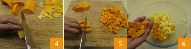 Nesse ponto, cuide da abóbora, começando por descascá-la e eliminando eventuais filamentos internos 4, obtendo cerca de 450 g. Corte-a primeiro em fatias e depois em cubos grandes de cerca de 3 cm 5 e transfira-os também para a tigela 6.