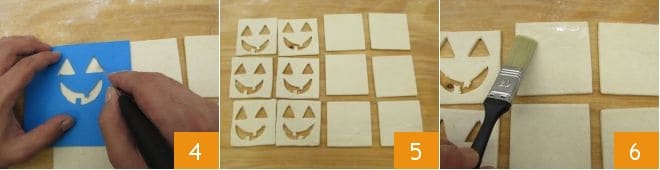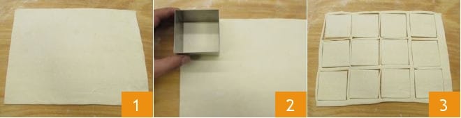 Para preparar as abóboras de massa folhada, abra a massa sobre uma superfície de trabalho levemente enfarinhada 1. Com um cortador de massa de 8 cm, corte 12 quadrados 2. Elimine a massa em excesso 3