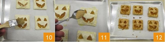 pincele a superfície com a gema diluída com um pouco de água 10, polvilhe com açúcar mascavo 11 e asse em forno pré-aquecido a 180° por 25 minutos. Após o tempo de cozimento, suas abóboras de folhada estarão bem douradas por cima 12: saboreie-as mornas ou mesmo em temperatura ambiente!