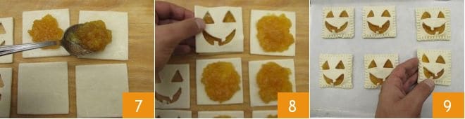 Coloque no centro uma colher de geleia de laranja 7, depois sobreponha a folhada com a silhueta cortada 8 e pressione bem as bordas para evitar que o recheio vaze durante o cozimento. Coloque as abóboras de folhada em uma assadeira forrada com papel manteiga 9,