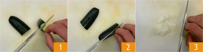 Para preparar as abobrinhas na frigideira saborosas com cebola, primeiro limpe e corte os legumes: retire a parte interna das abobrinhas 1, depois corte-as em palitos com 6 cm de comprimento e cerca de 1 cm de espessura 2. Corte as cebolas finamente 3.