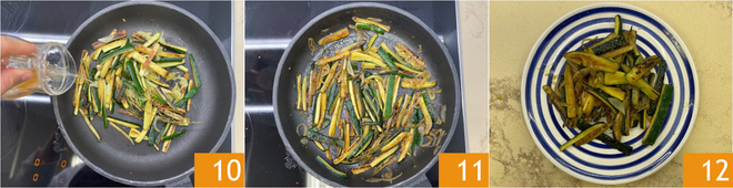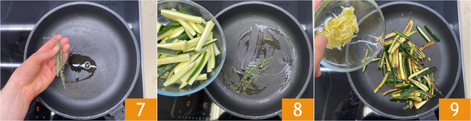 Limpe a mesma frigideira com um papel toalha e aqueça outro fio de óleo com os ramos de tomilho 7. Adicione as abobrinhas 8 e doure em fogo alto por 7-8 minutos. Quando estiverem bem douradas, coloque sal e junte as cebolas murchas 9.