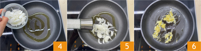 Aqueça um fio de óleo em uma frigideira, adicione as cebolas 4 e coloque sal 5, depois cozinhe em fogo médio-baixo por cerca de 10 minutos. Uma vez murchas 6, reserve-as em um prato.