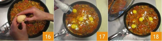 Quando o óleo subir à superfície, adicione algumas folhas de manjericão e as quebre diretamente na panela 16. Disponha-as, espaçando-as entre si. Ajuste o sal 17 e cubra com uma tampa 18.