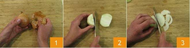 Para preparar a acqua cotta, como primeiro passo prepare o Caldo de legumes e mantenha-o aquecido. Comece descascando as cebolas 1, depois corte-as ao meio 2 e fatie-as finamente 3.