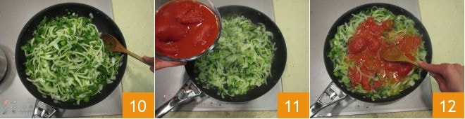 Misture com uma colher de pau 10 e deixe cozinhar até que a água tenha evaporado completamente. Depois, você pode adicionar os tomates pelados 11 e, usando a colher, esmagá-los delicadamente para quebrá-los 12.
