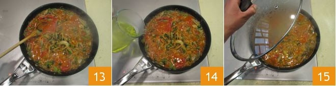 Misture tudo 13, adicione o caldo de legumes quente 14, misture novamente e cozinhe por cerca de 40 minutos, eventualmente cobrindo com uma tampa 15 e mexendo de vez em quando.