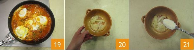 Deixe as gemas ficarem opacas, levará cerca de 4-5 minutos 19. Enquanto isso, quebre uma fatia fina de pão toscano amanhecido em cada cocotte. Você pode quebrá-lo com as mãos e dispor de forma a forrar o fundo 20. Adicione o pecorino ralado por cima 21