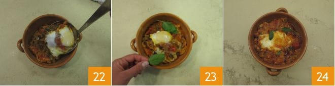 e com uma concha, adicione também a sopa, certificando-se de pegar um ovo para cada cocotte 22. Decore com um fio de azeite cru, uma folha de manjericão 23 e sirva a sua sopa 24.
