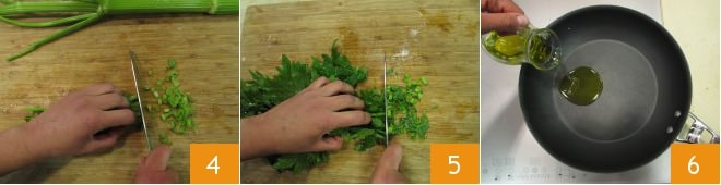 Transfira-as para uma tigela e passe para o aipo. Primeiro, lave-o bem, depois corte em fatias finas tanto os talos 4 quanto as folhas 5. Despeje o óleo em uma panela 6,
