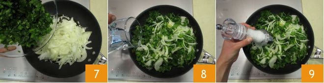 acenda o fogo e adicione as cebolas e o aipo 7. Adicione a água 8 e acrescente o sal 9.