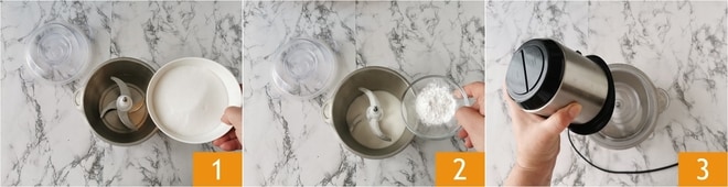 Para preparar o açúcar de confeiteiro caseiro, você precisará de um liquidificador, equipado com lâminas, muito potente. Coloque dentro o açúcar 1 e o amido de milho 2. Bata tudo por cerca de 2 minutos 3. Depois, pare, para deixar as lâminas esfriarem, e bata novamente por mais alguns minutos.
