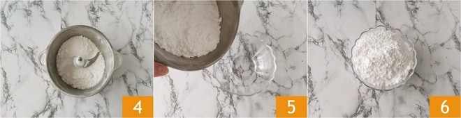Neste ponto, você terá obtido um pó fino, arejado e palpável 4. Transfira para uma tigela 5 e o açúcar de confeiteiro está pronto 6.