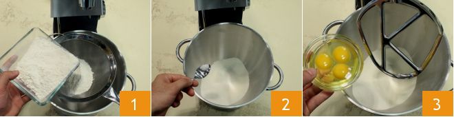 Para preparar os agnolotti, comece preparando a massa de ovo. Você pode consultar o procedimento na Escola de Culinária: massa fresca de ovo. Na tigela de uma batedeira, coloque a farinha peneirando-a diretamente na batedeira 1, uma pitada de sal 2 e os ovos 2.
