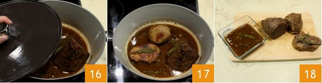 Por fim, adicione também o lombo 13; salgue e adicione pimenta e doure os pedaços de carne de todos os lados e cozinhe adicionando de vez em quando uma concha de caldo 14 para temperar a carne e favorecer o cozimento. Aos poucos se formará um fundo de cozimento denso e escuro 15.
