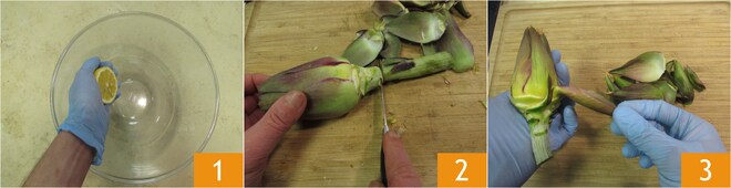 Para preparar as alcachofras na frigideira, prepare uma tigela com água acidulada 1 onde colocar as alcachofras à medida que as limpar. Use luvas para evitar sujar as mãos: corte uma parte da base, a parte mais dura 2. Em seguida, remova as folhas externas mais coriáceas 3, até chegar ao coração: as folhas terão a base mais clara.