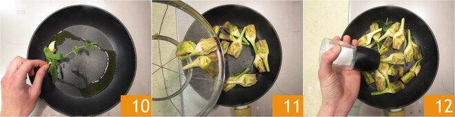 Adicione um raminho de hortelã 10 e coloque as alcachofras escorridas 11. Salgue 12 e deixe dourar por alguns instantes, mexendo ou agitando a frigideira.