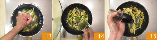 Cubra com a tampa 13 e cozinhe por 5 minutos. Depois, adicione o vinho branco 14 e deixe evaporar por alguns instantes o álcool. Tempere com pimenta a gosto 15.