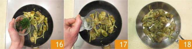 Tempere com a salsinha 16, misture novamente. Depois, adicione a água e deixe cozinhar por mais 10 minutos 17, desta vez sem a tampa. Suas alcachofras na frigideira estão prontas, sirva imediatamente 18.