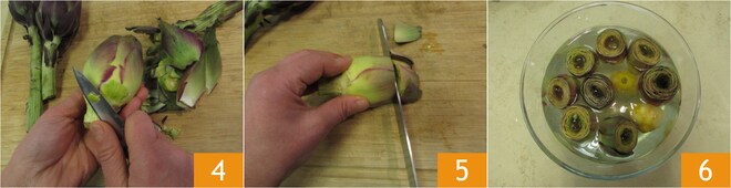 Com uma faca pequena (ou um descascador de legumes) descasque as alcachofras 4, corte também as pontas 5 e aos poucos coloque-as na água acidulada 6.