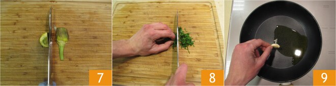 Uma a uma, escorra e divida ao meio 7: elimine o miolo interno sempre com a faca pequena. Divida cada metade novamente para obter fatias. Coloque-as novamente na água acidulada. Lave e pique finamente a salsinha 8. Aqueça um fio de azeite na frigideira com o alho 9.