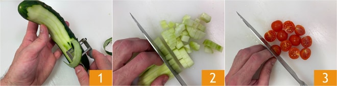 Para preparar as anchovas fritas, comece pela saladinha fresca de acompanhamento: descasque o pepino 1 e corte-o em cubos 2. Lave e corte ao meio os tomates-cereja 3.