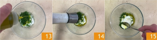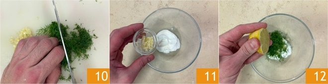 Pique também o endro 10. Em uma tigela, coloque o iogurte grego, o alho picado, o endro e tempere com suco de limão 12.