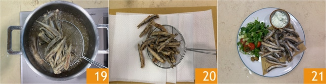 Quando as anchovas estiverem crocantes e douradas 19, escorra-as em um prato coberto com papel absorvente 20 e acrescente uma pitada de sal. Sirva suas anchovas fritas acompanhadas com a saladinha fresca e o molho de iogurte 21!