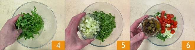 Em uma tigela, junte a rúcula 4, os pepinos 5, os tomates-cereja e as azeitonas taggiasca sem caroço 6.