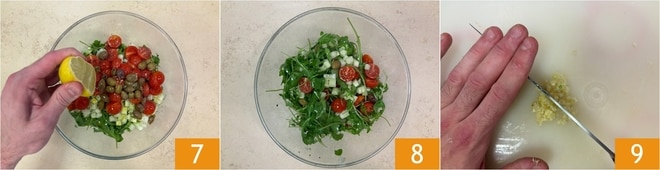 Tempere a salada com um fio de azeite de oliva extravirgem, suco de limão 7, sal e pimenta a gosto. Misture delicadamente para combinar os sabores e mantenha no fresco 8. Agora, prepare o molho de iogurte: descasque e pique o dente de alho 9.