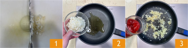 Para preparar as almôndegas ao molho da vovó, descasque e pique meia cebola 1. Em uma panela, despeje um fio de azeite e a cebola picada 2. Refogue a cebola por cerca de 5 minutos ou até que fique macia, depois adicione o purê de tomate 3 e salgue.