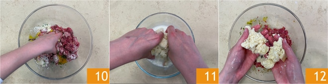 Misture para incorporar 10. Enquanto isso, o pão estará amolecido, esprema-o 11 e adicione-o ao restante da mistura 12.