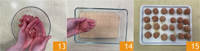 Retire uma porção da mistura e forme as almôndegas 13, passe-as na farinha de rosca 14 e coloque-as em uma bandeja 15.