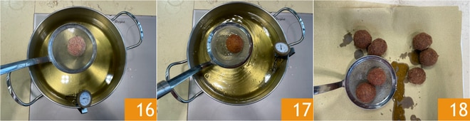 Aqueça o óleo de sementes para fritura, uma vez que atingir 170°C, mergulhe poucas almôndegas de cada vez 16 e frite até dourar 17. Escorra as almôndegas fritas em uma bandeja forrada com papel toalha 18.