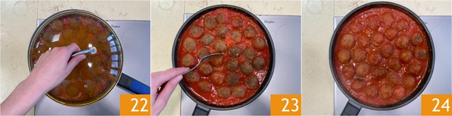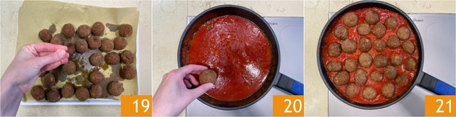Salgue 19 enquanto ainda estiverem quentes. Enquanto isso, o molho estará pronto; mergulhe aqui as almôndegas fritas 20, distribuindo-as lado a lado 21.