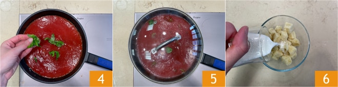 Tempere com as folhas de manjericão 4, cubra com uma tampa 5 e cozinhe por 10-15 minutos. Enquanto o molho cozinha, prepare as almôndegas: em uma tigela, coloque o leite com o pão duro para amolecer.
