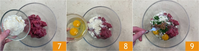 Em uma tigela, coloque a carne moída, o queijo 7, os ovos 8, o sal, a salsinha picada e as anchovas 9.