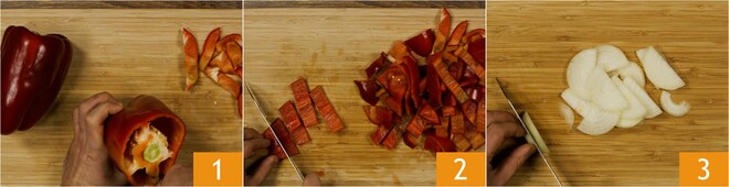 Para preparar as almôndegas ao molho de pimentões, primeiro lave e limpe os pimentões removendo o topo e as sementes internas 1, depois corte-os em pedacinhos 2. Limpe e fatie a cebola 3.