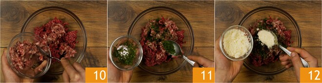 Em outra tigela, misture a carne moída, a linguiça sem pele 10, a salsinha 11 e o parmesão 12.